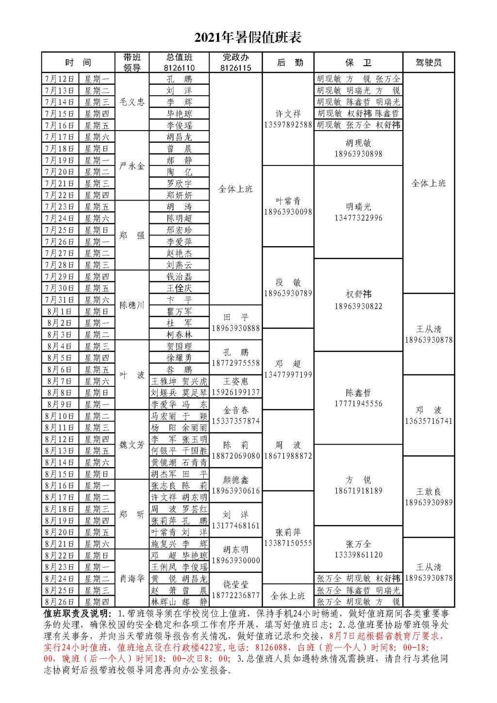 2021年暑假值班表