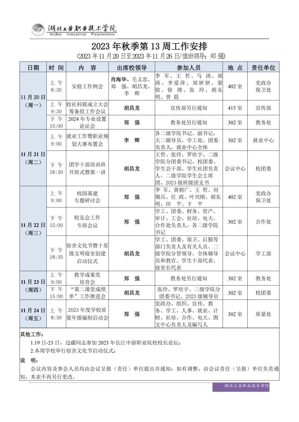 2023年秋季第13周工作安排