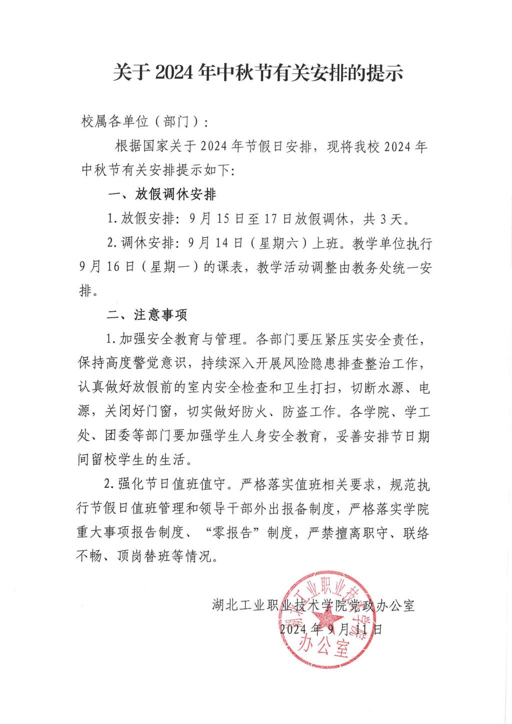 关于2024年中秋节有关安排的提示