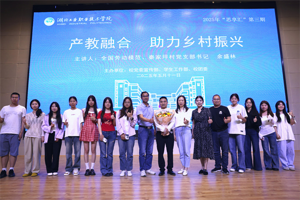 新闻网讯(文/李晓璇 图/李鑫)“简单的事情重复做,重复的事情用心做。力争把简单的事情做得不简单,把平凡的人生活出不平凡……”在2025年职业教育活动周来临之际,5月11日下午,第三期“思享汇”在和山会堂开讲。全国劳动模范、我校2019届校友、十堰市张湾区柏林镇秦家坪村党支部书记余盛林受邀为师生带来了一场主题为《产教融合——助力乡村振兴》的精彩宣讲,引发了大家对高职教育与乡村发展融合的深入思考。校党委委员、副校长李爱萍,学校相关职能部门负责人,生态环境学院、旅游商贸学院师生代表参加了此次活动。