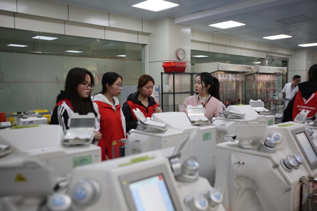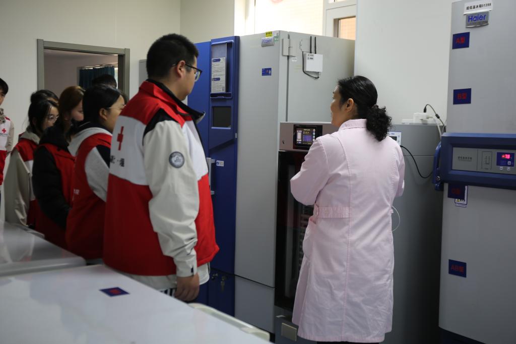 随后,在血站讲解员的引导下,同学们走进血站的“心脏”地带,沿着“爱心血液”的轨迹,进行了一次零距离的探秘之旅。从登记征询区的严谨细致,到体检初筛区的严格把关;从血液采集区的温馨舒适,到待检库的短暂停留;最终抵达最为神秘的血液制备实验室、检验科和储血库。“以前只知道献血是好事,但今天才真正明白,一袋血从采集到输入患者体内,竟要经历如此复杂而严谨的‘生命旅程’。每一个环节都凝聚着科学、责任与关爱。”志愿服务队队员区金妮同学在参观后感慨道。