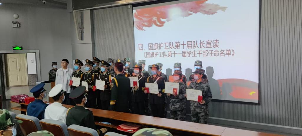 15:30大会在庄严的国歌声中拉开帷幕,校团委李路老师为第十届队员及带训干部发荣誉证书及胸章,随后第十届队长发言,并宣读国旗护卫队十一届学生干部任命名单,并进行了庄严的交接国旗护卫队队旗及指挥刀仪式。